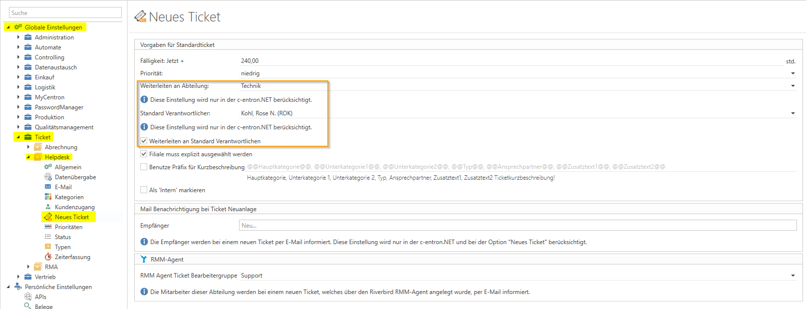 • In c-entron.NET unter Globale Einstellungen - Ticket - Helpdesk - Neues Ticket wurde bei "Weiterleiten an Abteilung" und "Weiterleiten an Verantwortlichen" und auch bei "Mail Benachrichtigung bei Ticket Neuanlage" die Info eingetragen/erweitert, dass diese Einstellungen nur in der c-entron.NET berücksichtigt werden.