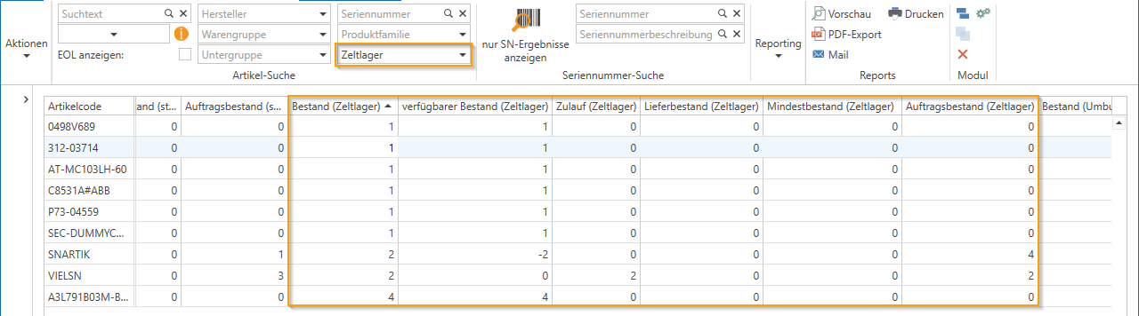 • In der Artikelübersicht wurden jeweils die Spalten "Bestand", "Verfügbarer Bestand", " Zulauf", "Lieferbestand“, „Mindestbestand“ und „Auftragsbestand“ für die vorhanden Nebenlager eingebaut. Der Name des Nebenlagers steht je Spalte in Klammern.