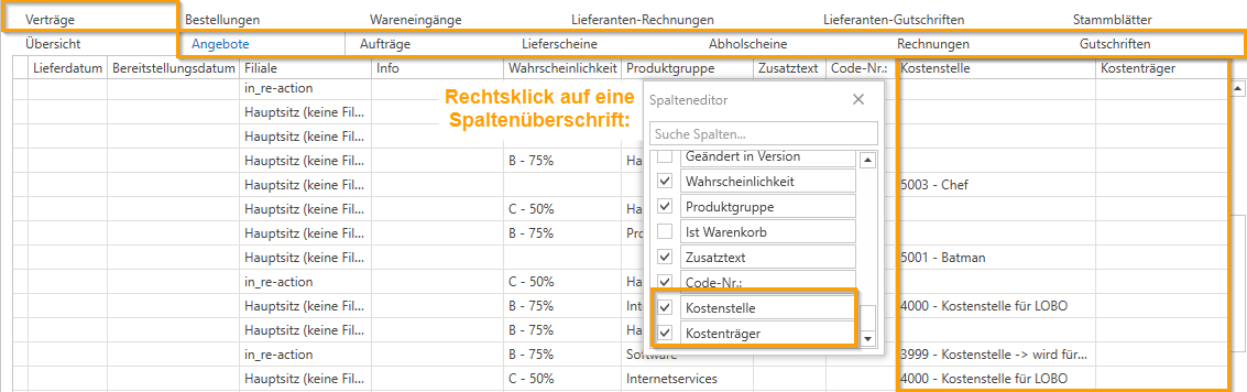 • In den Übersichten der einzelnen Kundenbelege (inklusive Verträge) wurden die Spalten Kostenstelle und Kostenträger hinzugefügt, die standardmäßig ausgeblendet sind und über den Spalteneditor (per Rechtsklick auf eine Spaltenüberschrift) eingeblendet werden können. (HINWEIS: Lieferantenbelege haben auf Kopfebene keine Kostenstelle oder Kostenträger, daher hier auch keine Spalten dafür.