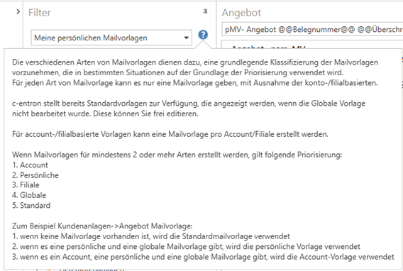 • Und es wurde eine Info - blaues (i) - zu den Mailvorlagen und dessen Priorisierung mit einem Beispiel hinzugefügt.
