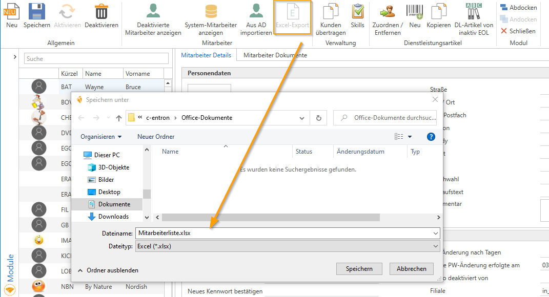 • In die Mitarbeiterverwaltung gibt nun in der Menüleiste/Ribbon den einen neuen Button "Excel-Export", wodurch die aktiven Mitarbeiter in eine Excel-Datei exportiert und gespeichert werden können.