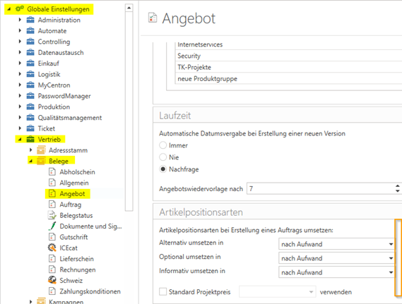 2. Ansonsten wird der Standard-Projektpreis (der unter Glob. Einstellungen Vertrieb - Belege - Angebot -> "Standard Projektpreis" + Auswahl des gewünschten PP hinterlegt werden kann) für Angebote/Aufträge/etc. genommen.