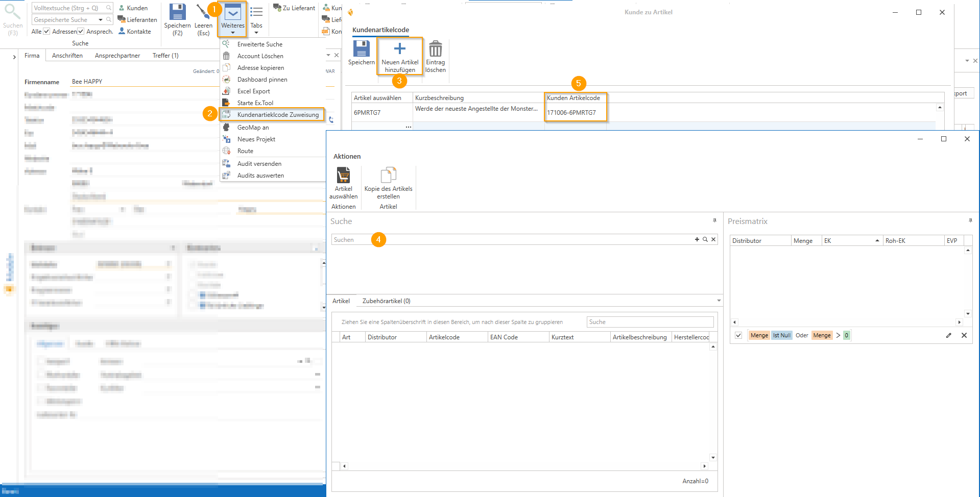 • Im Adressstamm im geöffneten Kunden kann nun über "Weiteres" (in der Ribbon/Menüleiste) - "Kundenartikelcode Zuweisung" und [Neuen Artikel hinzufügen] für diesen Kunden ein Artikel gesucht und diesem dann ein spezifischer "Kunden Artikelcode" hinterlegt werden.