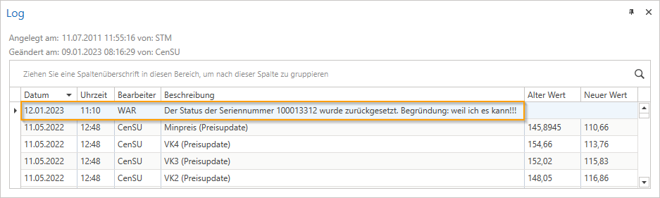 • Wird über die Funktion "Status anpassen" bei einer Seriennummer der Staus zurückgesetzt, wird diese Aktion (inklusive Begründung) nun in der Artikelverwaltung beim Artikel ins Artikel-Log hinterlegt.