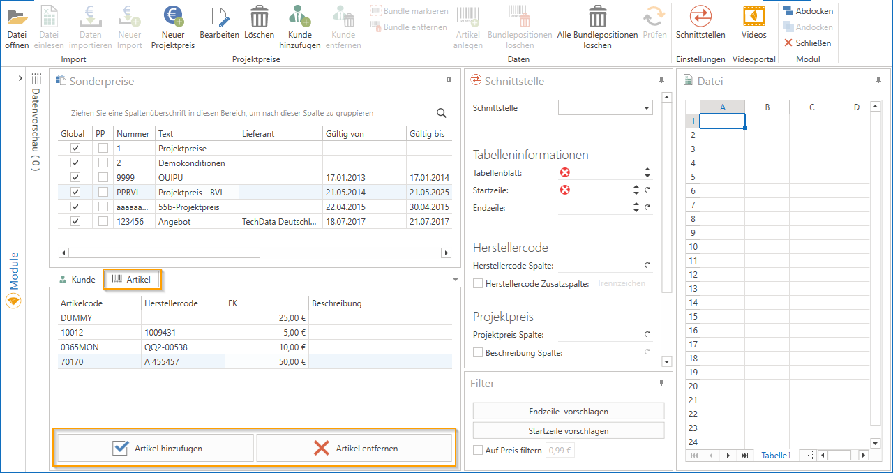 • Im Modul 'Projektpreis Import' ist es nun möglich zu einem ausgewählten Sonderpreis, im Tab 'Artikel', weitere Artikel hinzuzufügen/zu entfernen.