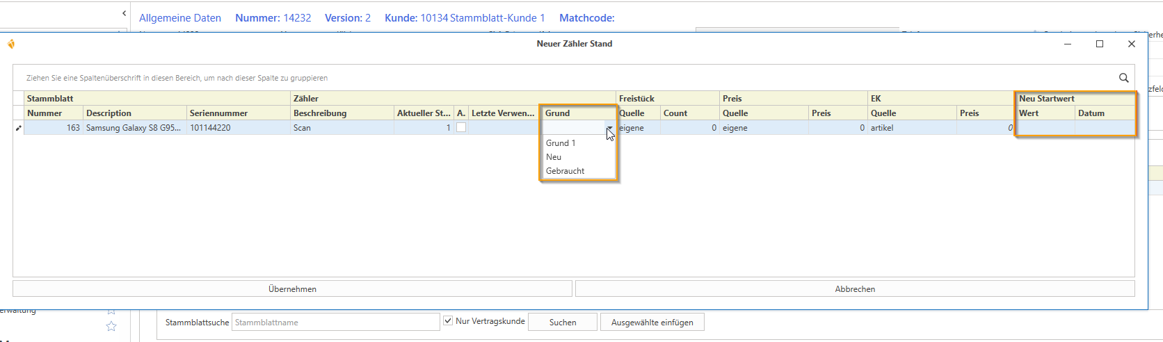 • Wenn in der c-entron.NET ein Stammblatt einem "stammblatt-bezogenen" Vertrag zugewiesen wird, kann nun für die Zähler sowohl der "aktuelle Zählerstand/neue Startwert" als auch der "Grund" mit eingefügt werden.