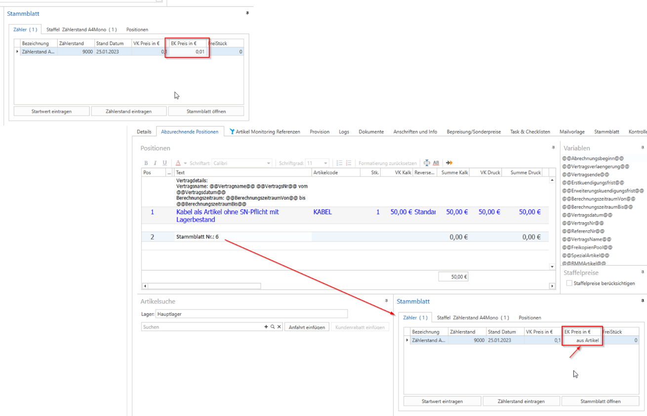 • In einem Vertrag mit Klickzählern bei dem Stammblatt in den Positionen der Preis für den VK und EK eingetragen wird, konnte es vorkommen, dass fälschlicherweise beim EK der Zähler "aus Artikelstamm" angezeigt wurde, obwohl ein EK-Preis für diesen Zähler hinterlegt wurde. Dieser Anzeigefehler wurde behoben.