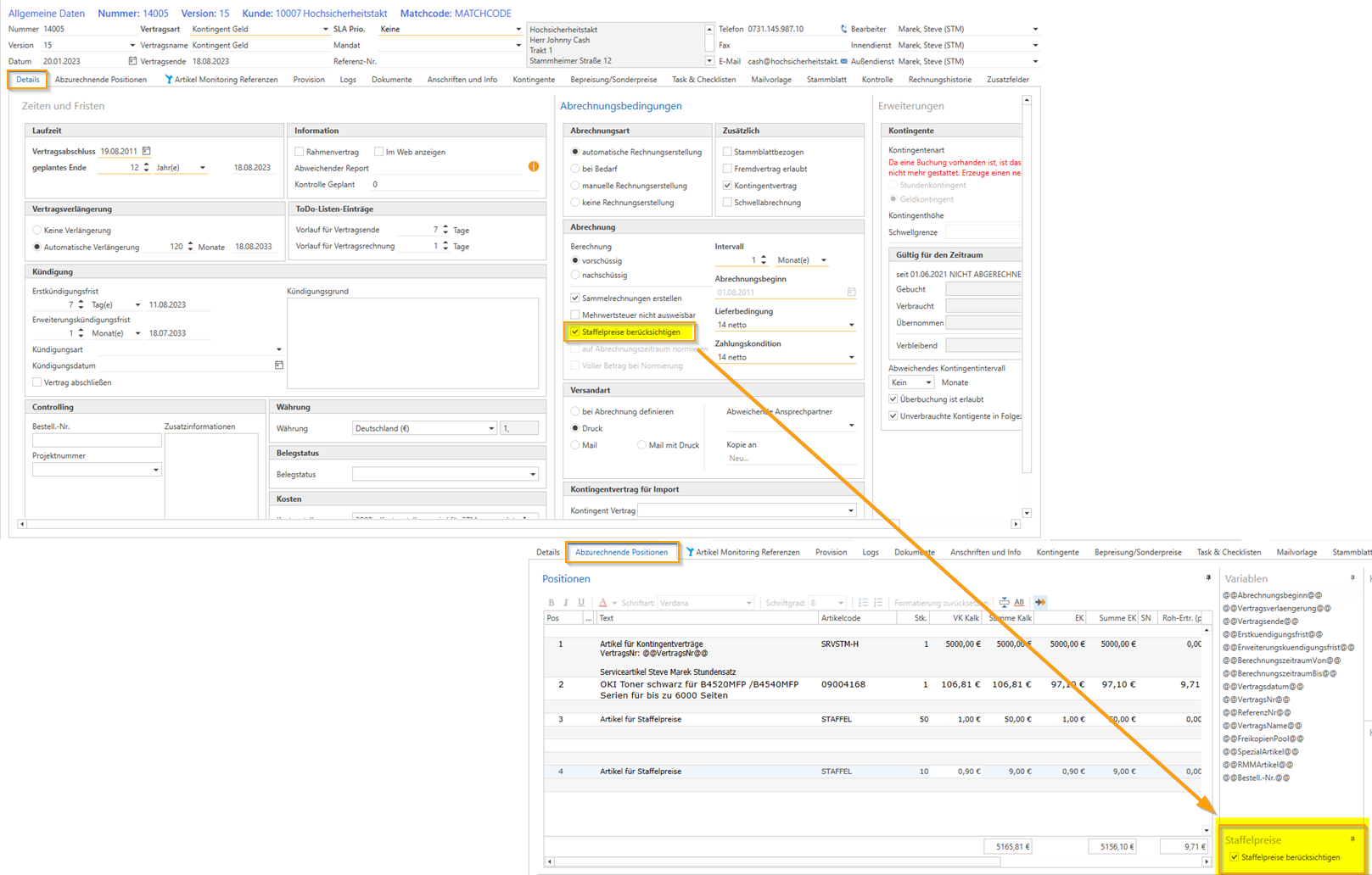 • Wenn in einem Vertrag in den "Details" die Checkbox "Staffelpreise berücksichtigen" aktiviert ist, wird dies in den Positionen auch umgesetzt bei der Stückzahl-Änderung. Zusätzlich wurde nun, um dies leichter "erkennen" zu können, im Reiter "Positionen" unter den "Variablen" diese Einstellung nochmal "gespiegelt", damit dies bei den Positionen schneller "ersichtlich" ist.