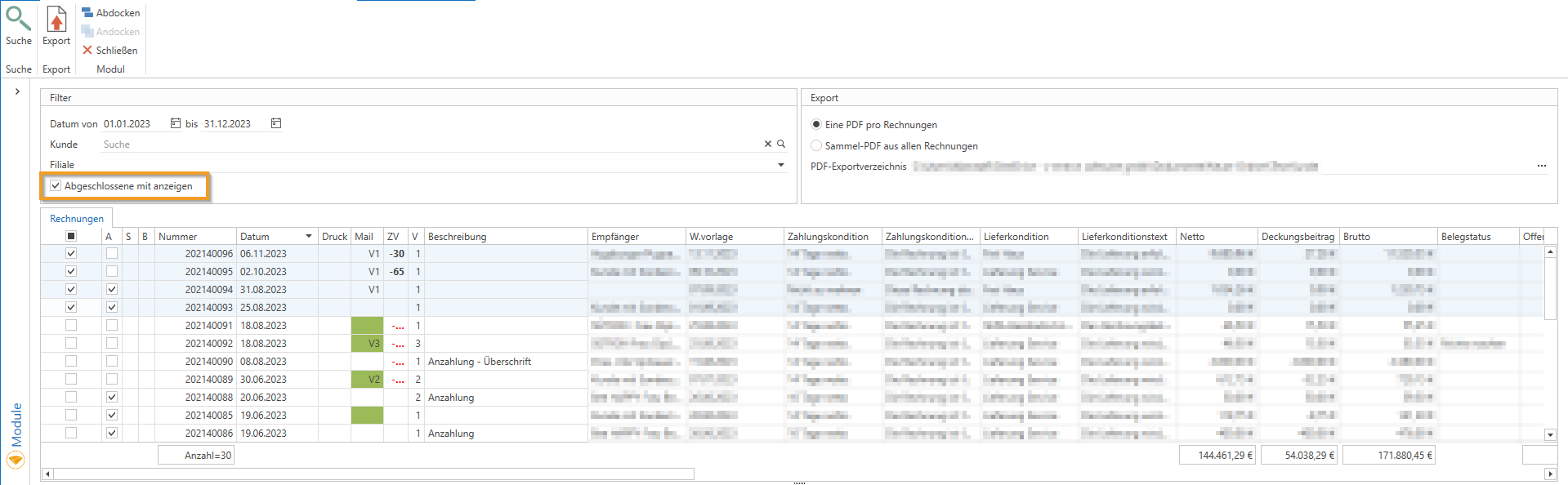Die Checkbox "Abgeschlossene mit anzeigen" ermöglicht nun beim Export von Rechnungs-PDFs die Anzeige und den Export abgeschlossener Rechnungen.