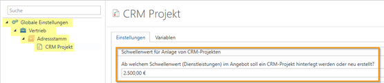Grundlegende Einstellung: In den Einstellungen unter „Globale Einstellungen“ - > "Vertrieb" -> "Adressstamm" -> "CRM – Projekt“ legen Sie den Schwellenwert für die Gesamtsumme der Dienstleistungen fest. (Die Gesamtsumme bezieht sich auf den Netto Wert). Ohne festgelegten Wert ist die Funktion global deaktiviert.
