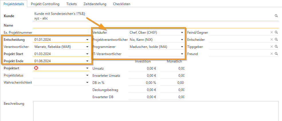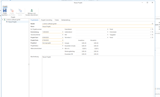 In CRM-Projekten werden bei der Erfassung eines neuen Projekts die Betreuer des Kunden direkt nach Auswahl des Kunden automatisch eingefügt, und der Ersteller des Projekts wird als Verantwortlicher eingetragen. Wenn das Datum der Entscheidung bei einem neuen Projekt eingetragen wird, bei dem noch kein "Projekt Start" und "Projekt Ende" festgelegt sind, werden automatisch für den "Projekt Start" zwei Monate später und für das "Projekt Ende" fünf Monate später vorgeschlagen. Zum Beispiel: Wenn das Entscheidungsdatum der 01.01.2024 ist, wird der "Projekt Start" auf den 01.03.2024 und das "Projekt Ende" auf den 01.06.2024 vorbelegt.