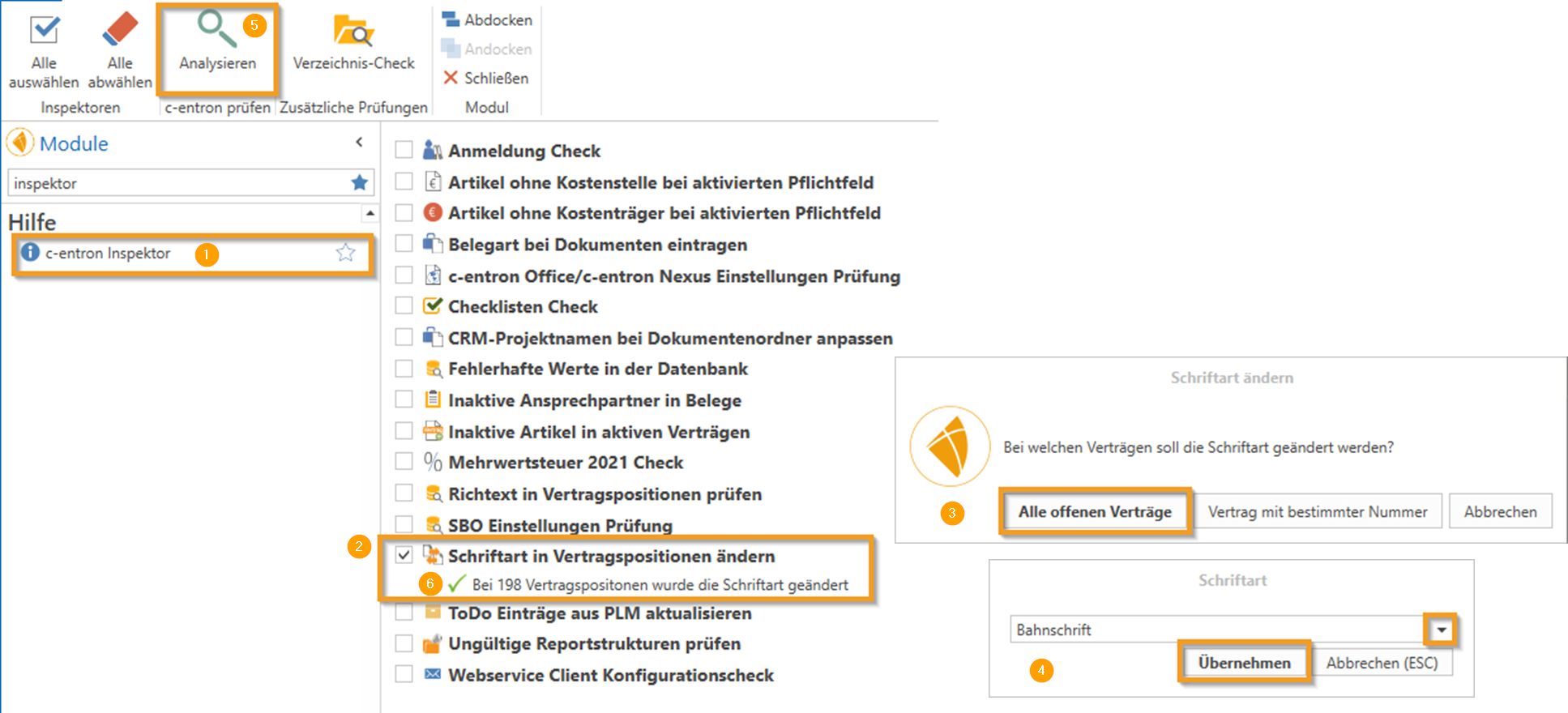 Die neue Funktion "Schriftart in Vertragspositionen ändern" im c-entron Inspector ermöglicht die Anpassung der Schriftart in Vertragspositionen. Der Inspector ermöglicht die Auswahl bestimmter Verträge anhand ihrer Nummer oder die Anwendung auf alle offenen Verträge. Anschließend kann die gewünschte Schriftart für die ausgewählten Vertragspositionen festgelegt werden. Nach dem Klick auf [Analyse] zeigt der c-entron Inspector in einer Information an, in wie vielen Vertragspositionen die Schriftart erfolgreich geändert wurde.
