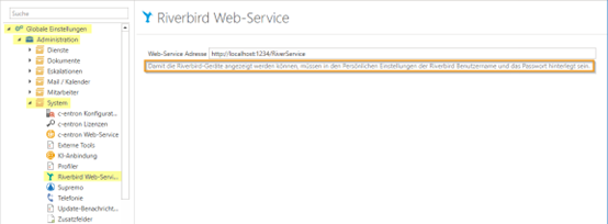 1. c-entron: Überprüfen Sie in den globalen Einstellungen – Administration - System, ob der Riverbird WebService in Ihrer c-entron hinterlegt ist. Falls nicht, fügen Sie ihn bitte hinzu. Beachten Sie, dass dies möglicherweise bereits ausgefüllt ist – prüfen Sie, ob die URL mit der des River-WebService übereinstimmt.