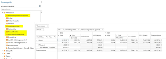 Die Vertriebsauswertung in Analytics wurde um neue Felder für Produktfamilie und Vertragsartikel erweitert. Innerhalb der Gruppe ""Artikeldaten"" sind nun folgende Informationen verfügbar: o Produktfamilie o Produktfamiliengruppe o Ist Vertragsartikel o Abrechnungsintervall (geplant) Die Bezeichnung ""Abrechnungsintervall (geplant)"" wurde gewählt, da der Wert aus dem Artikelstamm stammt. Der tatsächliche Abrechnungsintervall wird erst in den Verträgen festgelegt.