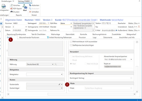 Sollte der Vertrag zu einer anderen Filiale, aufgrund des Nummernkreis gewechselt werden müssen, kann dies im Vertrag, im Reiter "Details" geändert werden.