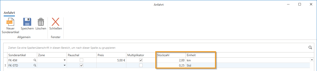 Im Adressstamm unter "Anschriften" im Abschnitt "Anfahrt" wurden Anpassungen vorgenommen, um einen Zeitwert bei Anfahrten zu ermöglichen: Die Spalte "Kilometer" wurde zu "Stückzahl" umbenannt und unterstützt nun Dezimalstellen. Zudem wurde eine neue "Einheit"-Spalte hinzugefügt, die die Artikeleinheit anzeigt. Bei der Verwendung der Funktion "Anfahrt einfügen" im Beleg wird der ausgewählte Vertrag nun bei der entsprechenden Position im Beleg hinterlegt; bei einem Kontingentvertrag wird bei entsprechender Einstellung auch eine Ausgleichsposition eingefügt.