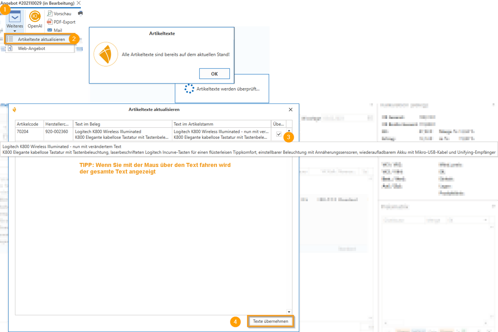 In der Menüleiste/Ribbon für Kundenbelege unter dem Button "Weiteres" steht nun die praktische Funktion "Artikeltexte aktualisieren" zur Verfügung (diese war zuvor nur auf Belegvorlagen beschränkt). Nach dem Klicken auf "Weiteres" - "Artikeltexte aktualisieren" im geöffneten Kundenbeleg bekommen Sie entweder die Meldung, dass die Artikeltexte bereits auf den aktuellen Stand sind, oder es öffnet sich ein neues Fenster, in dem Sie den „Text im Beleg“ und den „Text im Artikelstamm“ sehen und dann auswählen können, bei welchen Positionen die Texte aktualisiert werden sollen. Dazu aktivieren Sie in der letzten Spalte "Übernehmen" das Kästchen/Checkbox. durch Klick auf "Texte übernehmen" wird Ihr Beleg entsprechend aktualisiert.