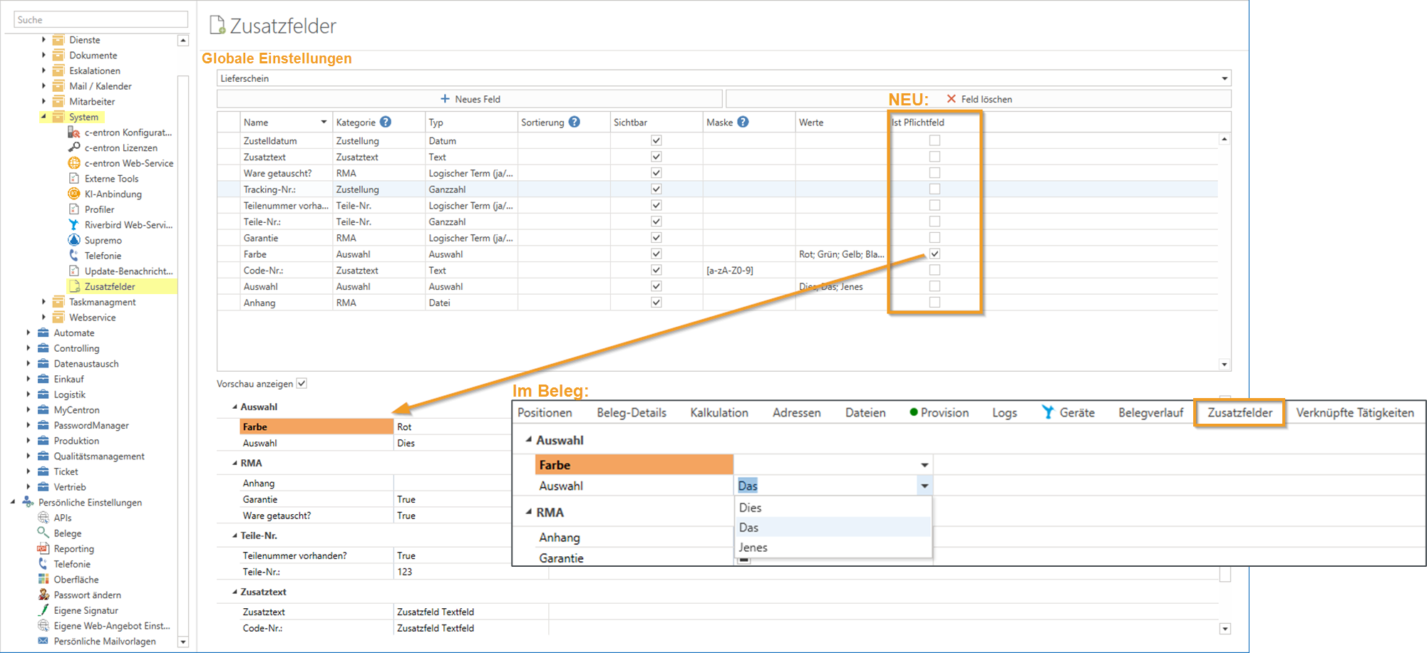 Sie haben nun (unter Globale Einstellungen - Administration - System - Zusatzfelder) die Möglichkeit Zusatzfelder als Pflichtfelder zu definieren. Diese werden dann in der Übersicht Orange markiert. Sollte dies Zusatzfeld beim Speichern des Belegs nicht hinterlegt worden sein, kommt eine Hinweismeldung diesbezüglich.