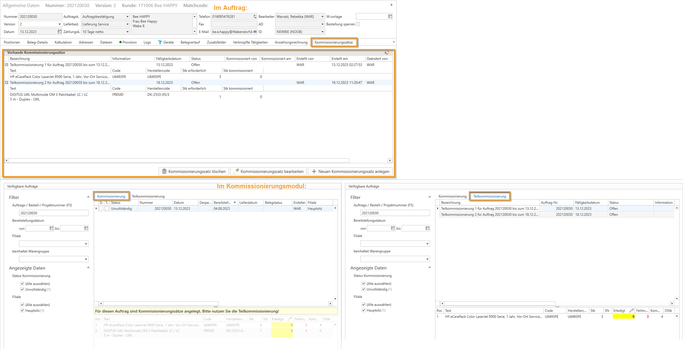 Das neue Feature "Teilkommissionierung/Kommissionierungssätze im Auftrag" ermöglicht eine effiziente Teilkommissionierung durch die Einführung des Tabs/Reiters "Kommissionierungssätze" im Auftrag und der Kommissionierung. Dadurch können Sie gewünschte Positionen des jeweiligen Auftrags in mehrere Kommissionierungssätze gruppieren. Diese Sätze können dann in verschiedenen Etappen (pro Kommissionierungssatz) ausgeliefert werden. Eine ausführliche Anleitung dazu finden Sie hier:Teilkommissionierung/Kommissionierungssätze im Auftrag