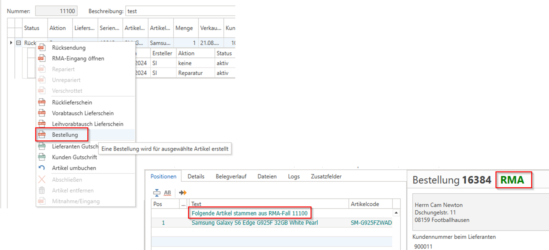 Im RMA-Ticket kann man nun als Aktion auch "Bestellung" wählen. Anschließend können Sie den Lieferanten wählen, bei dem Sie für diesen RMA-Fall Artikel bestellen möchten. In der Bestellung und den Folge-Belegen wird dies dann auch anhand des Freitextes bei den Positionen sowie der Anzeige "RMA" neben der Belegnummer angezeigt.