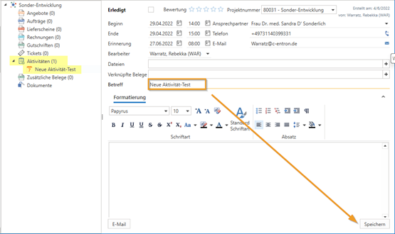 Im CRM-Projekt besteht nun die Option, den Betreff einer Aktivität zu bearbeiten. Die Änderungen können durch Bestätigen mittels des Speichern-Buttons unten rechts vorgenommen werden.