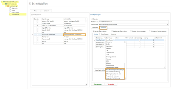 Die Benutzerdefinierte Schnittstelle des Buchhaltungsexports wurde um zusätzliche Felder erweitert. Nun können Sie "Abw. Rechnungsmailempfänger", "Versandart für Rechnung", "Zahlungskondition als Text", "Ansprechpartner für Mahnung" und "Versandart für Mahnung" unter dem Reiter "Designer" - "Struktur" im Auswahlmenü der Zuordnung finden.