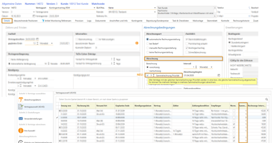 Mit der Einführung der "Sammelrechnung Priorität" in der Vertragsverwaltung können Sie nun diese Funktion aktivieren und eine Zahl von 1 bis 10 für jeden Vertrag unter "Details" bei "Abrechnung" hinterlegen. Dadurch werden alle Verträge mit derselben Sammelrechnungs-Priorität bei der Vertragsabrechnung in eine gemeinsame Sammelrechnung aufgenommen. Diese Neuerung ermöglicht es Ihnen, mehrere Verträge auf verschiedene Sammelrechnungen aufzuteilen und flexibel abzurechnen.