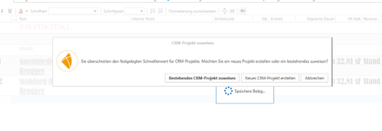 Anleitung: 1. Im Belegwesen, wenn Sie ein Angebot erstellen und diesem noch kein Projekt zugeordnet haben und den Schwellenwert überschreiten (nur Dienstleistungsartikel werden berücksichtigt), erhalten Sie beim Speichern eine Auswahlmöglichkeit. 2. Sie können wählen, ein bestehendes CRM-Projekt zuzuweisen oder ein neues CRM-Projekt zu erstellen.