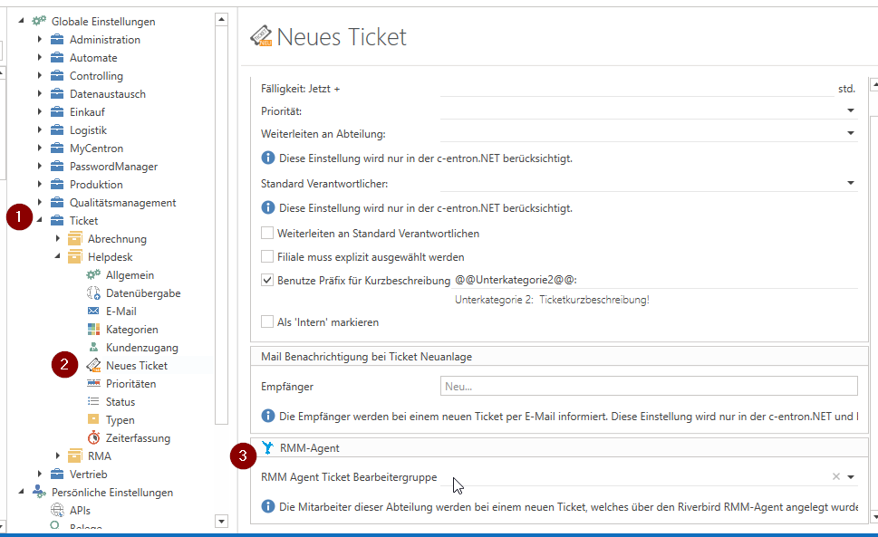 Das Entfernen der "RMM Agent Ticket Bearbeitergruppe" (unter Globale Einstellungen - Ticket - Helpdesk - Neues Ticket) führt nun auch dazu, dass der Mailversand aus c-entron heraus deaktiviert werden kann.