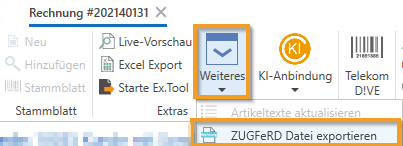 - Über den neuen Button „ZUGFeRD Datei exportieren“ (zu finden unter „Extras - Weiteres“ in der Rechnungsmaske eines Kunden) können Sie jetzt ausschließlich die XML-Datei herunterladen. Diese Datei können Sie beispielsweise in ein Portal hochladen oder separat an den Kunden senden.