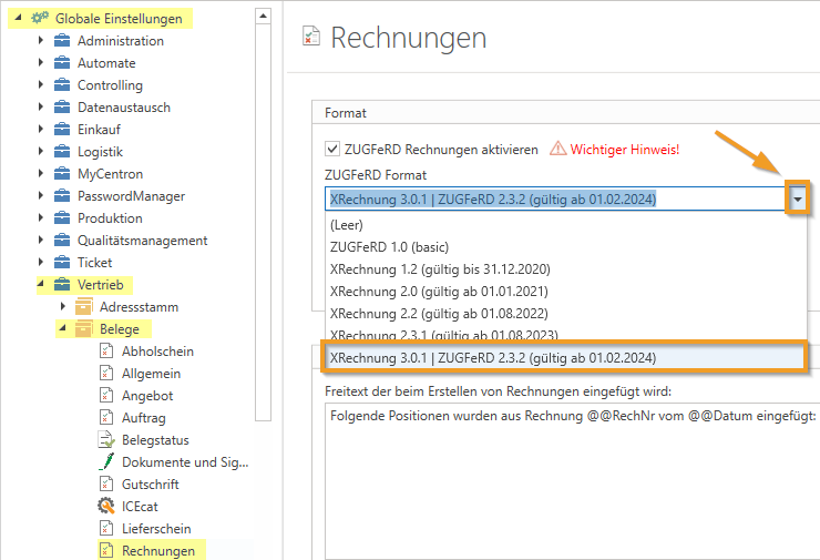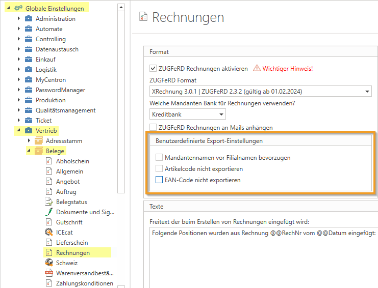 - Es wurden in den ZUGFeRD-Einstellungen unter (Globale Einstellungen - Vertrieb - Belege - Rechnungen im Bereich Format) drei neue Checkboxen eingeführt, mit denen Sie folgende Optionen steuern können: