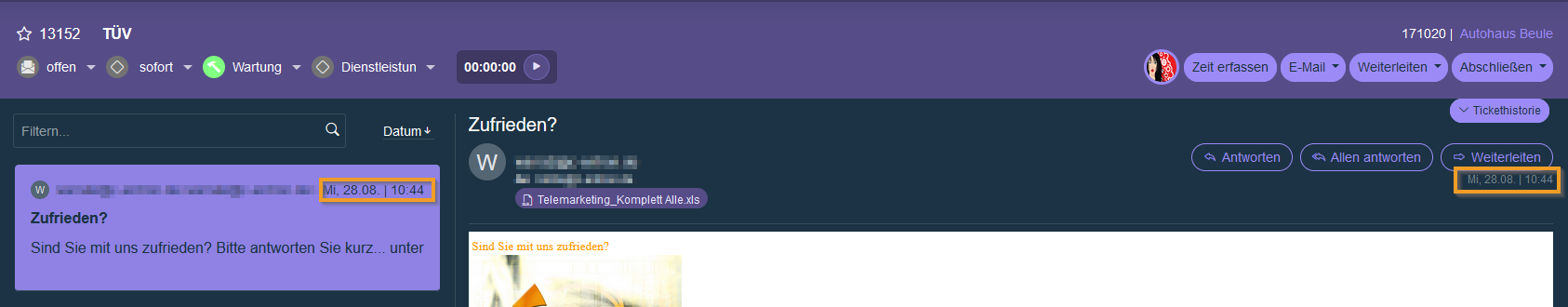 - Das "Erstellt am"-Datum sowie die Fälligkeit mit Uhrzeit werden nun in der Kanban-Übersicht der Tickets angezeigt. Wenn die Fälligkeit noch heute ist, wird nur die Uhrzeit angezeigt. Ist die Fälligkeit innerhalb dieses Jahres, wird keine Jahreszahl angezeigt. Liegt die Fälligkeit jedoch im kommenden oder vergangenen Jahr, wird die Jahreszahl eingeblendet.