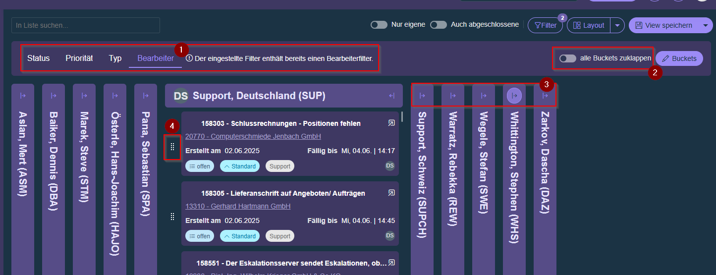 - Drag & Drop-Funktion(4): Tickets können nun per Drag & Drop (über das Symbol mit den 6 Punkten) zwischen Buckets verschoben werden. Dabei wird der Status, die Priorität, der Typ oder der Bearbeiter durch die Zielspalte ersetzt.