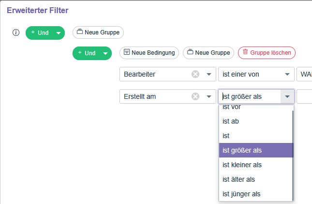 Es wurden zahlreiche neue Spalten ergänzt, sodass nun nahezu alle Spalten aus dem alten Service-Board auch im neuen verfügbar sind. Zudem wurden die Filtermöglichkeiten deutlich erweitert – insbesondere für Datumsfelder stehen nun umfassende Filteroptionen zur Verfügung, und es kann auf alle Spalten gefiltert werden.