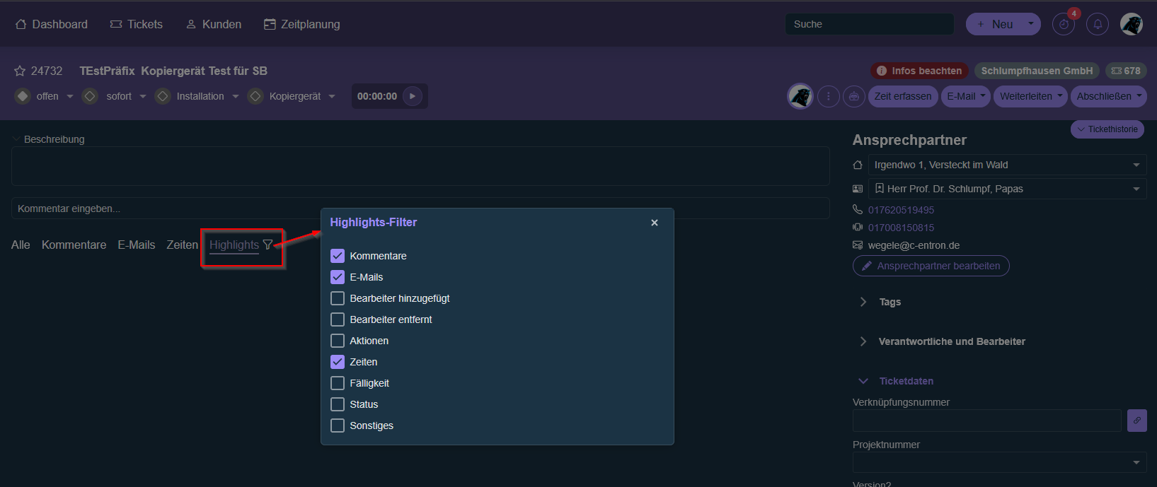 In der Ticketansicht gibt es einen neuen Reiter namens „Highlights“. Dieser Bereich dient der besseren Übersicht über die wichtigsten Einträge im Ticket. Du kannst mit einem Filter individuell festlegen, welche Arten von Einträgen angezeigt werden sollen, z. B.: