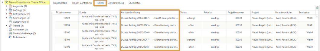 - In CRM-Projekten wird nun auch im geöffneten Projekt unter dem Reiter "Tickets" die Spalte "Kurzbeschreibung" in der Ticketübersicht angezeigt.