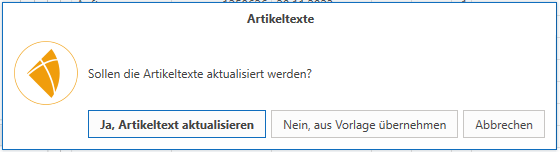 - Wenn ein neuer Beleg aus einer Belegvorlage heraus erstellt wird oder wenn ein neuer Beleg aus der Belegübersicht per "Rechtsklick -> Kopie erstellen bei Adresse" erstellt wird, erscheint nun nach der Abfrage ob die "Artikelpreise aktualisiert" werden sollen (hierbei wird der aktuelle VK/EK aus dem Artikelstamm übernommen) automatisch die neue Abfrage ob die "Artikeltexte aktualisiert" werden sollen (hierbei wird die Artikelbeschreibung aus dem Artikelstamm verwendet).