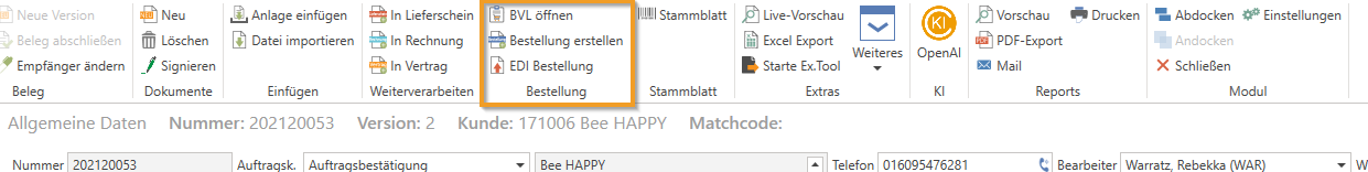 - Im Bereich der Aufträge wurde die Option "Bestellung" in die Menüleiste/Ribbon integriert, um eine direkte Zugänglichkeit zu den Funktionen "BVL erstellen", "Bestellung erstellen" und "EDI Bestellung" zu ermöglichen.