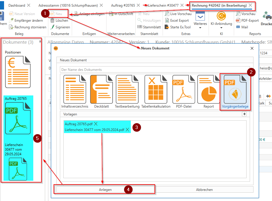 - Es wurde im Kunden-Belegwesen folgende neue Funktion eingebaut: Wenn ein Beleg erstellt wurde (ab dem ersten Speichern), kann nun über "Dokumente -> Neu" die Auswahl auf "Vorgängerbelege" getroffen werden. Hier werden nun alle PDFs aus den verknüpften Vorgängerbelegen wie Lieferschein, Auftrag, Angebot angezeigt. Die gewünschten Dateien können nun per Multiselect ausgewählt und per Klick auf "Anlegen" in den aktuellen Beleg als "Dokumente" übernommen werden. Diese können dann wie gewohnt beim Erstellen der PDF (Vorschau/Mail/Druck/PDF-Export) auswählbar in die PDF übernommen werden.