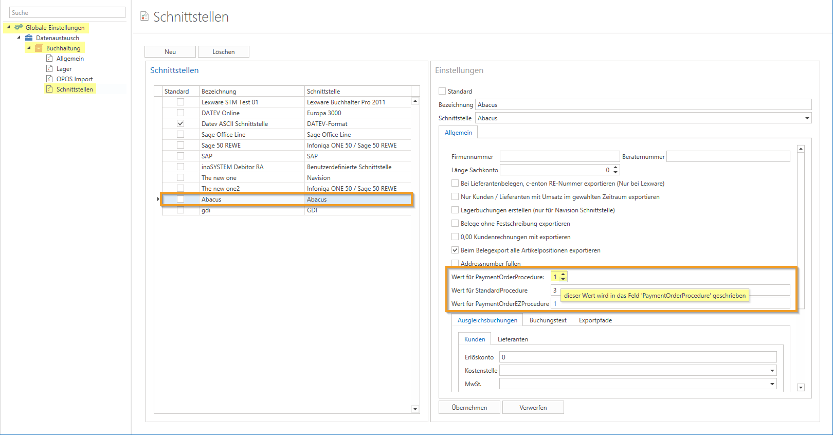- Wird nun in den Einstellungen "ABACUS" als Schnittstelle auswählt, erscheinen nun die zwei Felder "Wert für StandardProcedure" und "Wert für PaymentOrderEZProcedure".