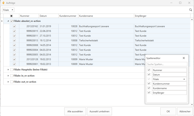 - Der Dialog für den Import der Aufträge wurde überarbeitet und verfügt nun über zusätzliche Felder wie "Datum", "Filiale", "Kundennummer" und "Kundenname" aus den Aufträgen. Das Grid wurde durch eines von DevExpress ersetzt, was es ermöglicht, nach Spalten zu gruppieren. Zum Beispiel kann nach "Filiale" gruppiert werden, und mittels einer Checkbox in der Gruppe können alle Aufträge dieser Filiale ausgewählt werden.
