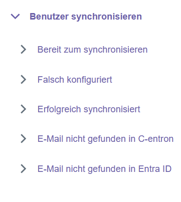 In diesem Abschnitt kann der Administrator den Status der Synchronisierung zwischen Entra ID und c-entron Benutzern überwachen und die Synchronisierung für viele Benutzer in großen Mengen aktualisieren. Die Synchronisierung ist erforderlich, damit sich Benutzer mit Microsoft anmelden können.