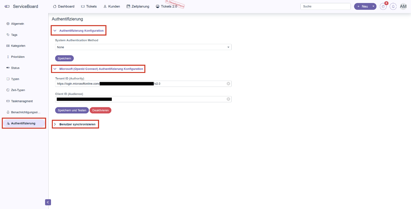 Der Bereich "Authentifizierung" ist nun in drei Abschnitte aufgeteilt: