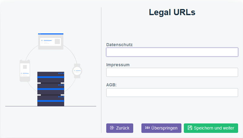 - Hinterlegen Sie URLs für Impressum, AGB und Datenschutz, die Sie beispielsweise von Ihrer Website verwenden können, um sicherzustellen, dass alle rechtlichen Informationen im ServiceBoard korrekt angezeigt werden.