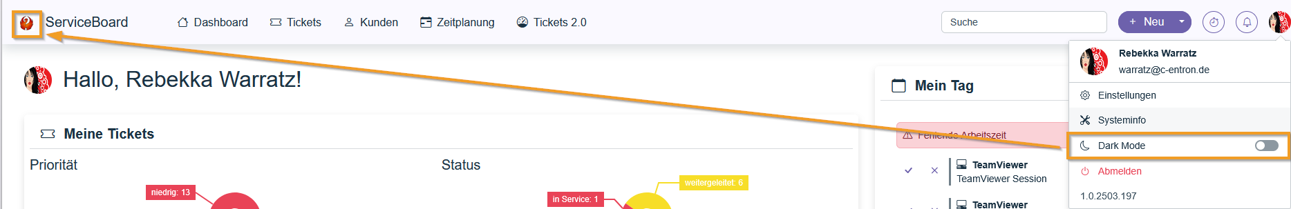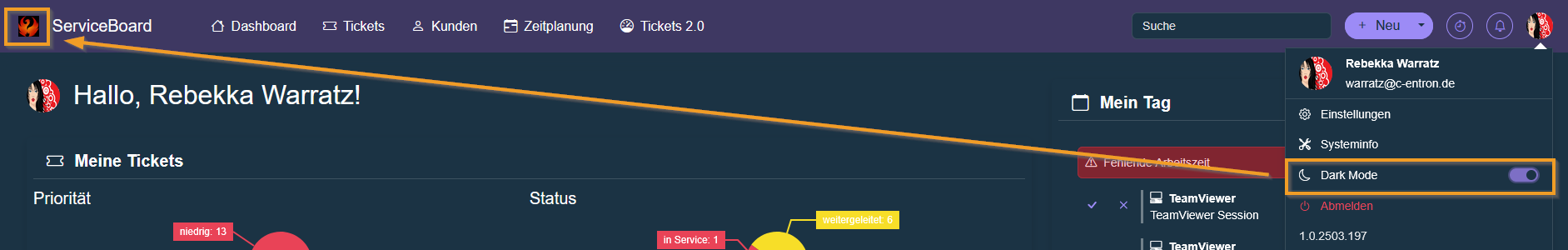 Das Logo wird im geöffneten ServiceBoard im Dark Mode (dunkles Design) oben auf der linken Seite neben „ServiceBoard“ angezeigt.