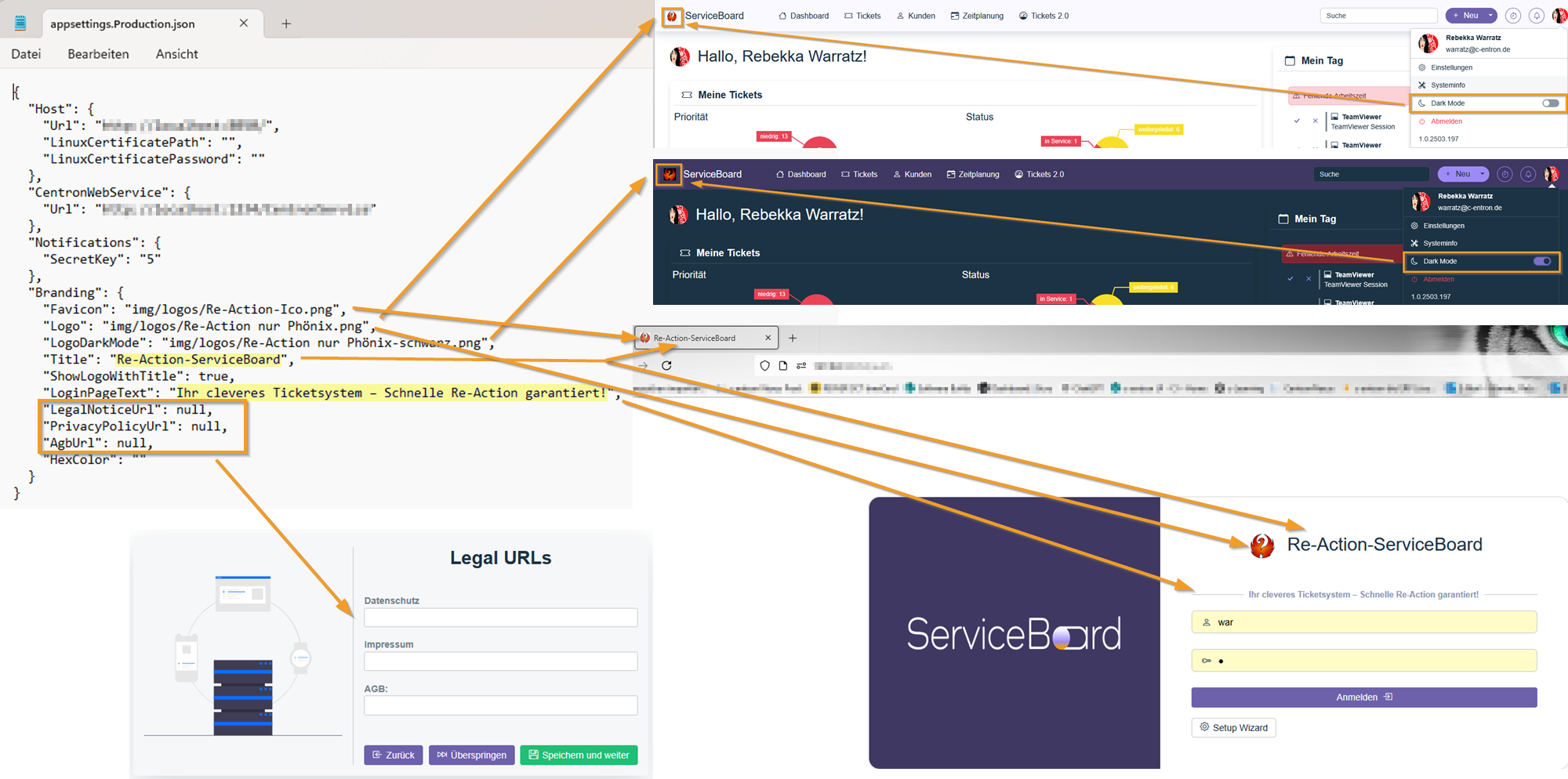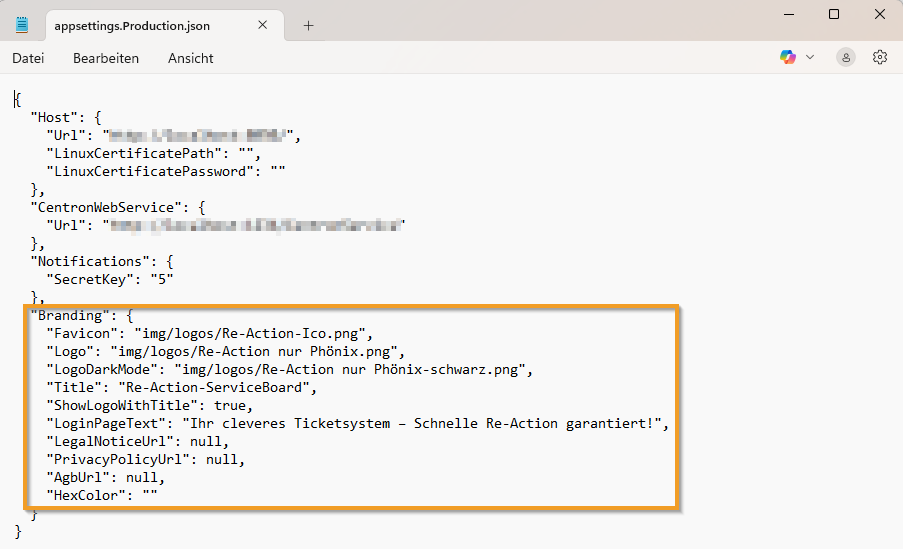 Die Datei „appsettings.Production.json“ im Installationsverzeichnis (z. B. C:\Program Files (x86)\c-entron software gmbh\c-entron Nexus\) ermöglicht die Anpassung des Erscheinungsbilds des ServiceBoards (Nexus).