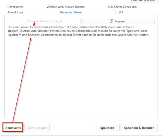 Nachdem der Dienst gestoppt wurde, können Sie einen neuen Geheimschlüssel generieren. Dabei ist die Funktion „Kopieren“ deaktiviert. Es erscheint zudem ein Hinweis, dass der neue Schlüssel durch einen Klick auf „Speichern“ übernommen werden muss. Das Speichern erfolgt ohne, dass der Connection-Manager automatisch geschlossen wird.