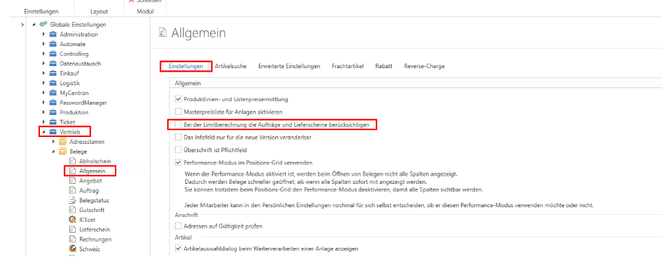 Limit: Hier können Sie ein Limit in Brutto eintragen z.B. für Erstbesteller/Neukunden/usw. Dadurch werden Sie darauf aufmerksam gemacht, sobald der Kunde dieses Limit überschreitet. Standardmäßig werden dafür nur Rechnungen miteinberechnet. In den globalen Einstellungen haben Sie jedoch die Möglichkeit noch weitere Belegarten einrechnen zu lassen.