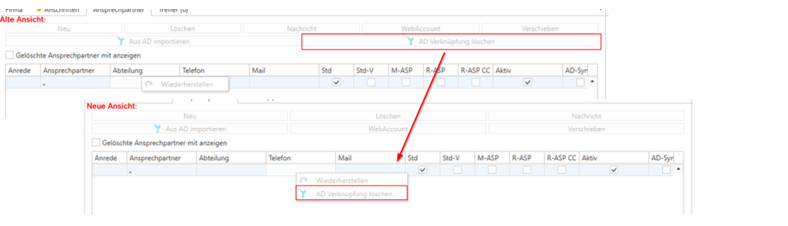 Bei Ansprechpartner wurde die Oberfläche dahingehend überarbeitet, dass die AD-Verknüpfung nicht mehr als Button, sondern über rechte Maustaste im Kontextmenü eines markierten Ansprechpartners zu finden ist.