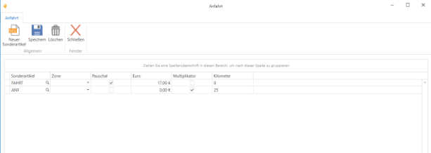 Zu jeder Anschrift können Anfahrtsartikel und/oder Fahrtkosten hinterlegt werden.